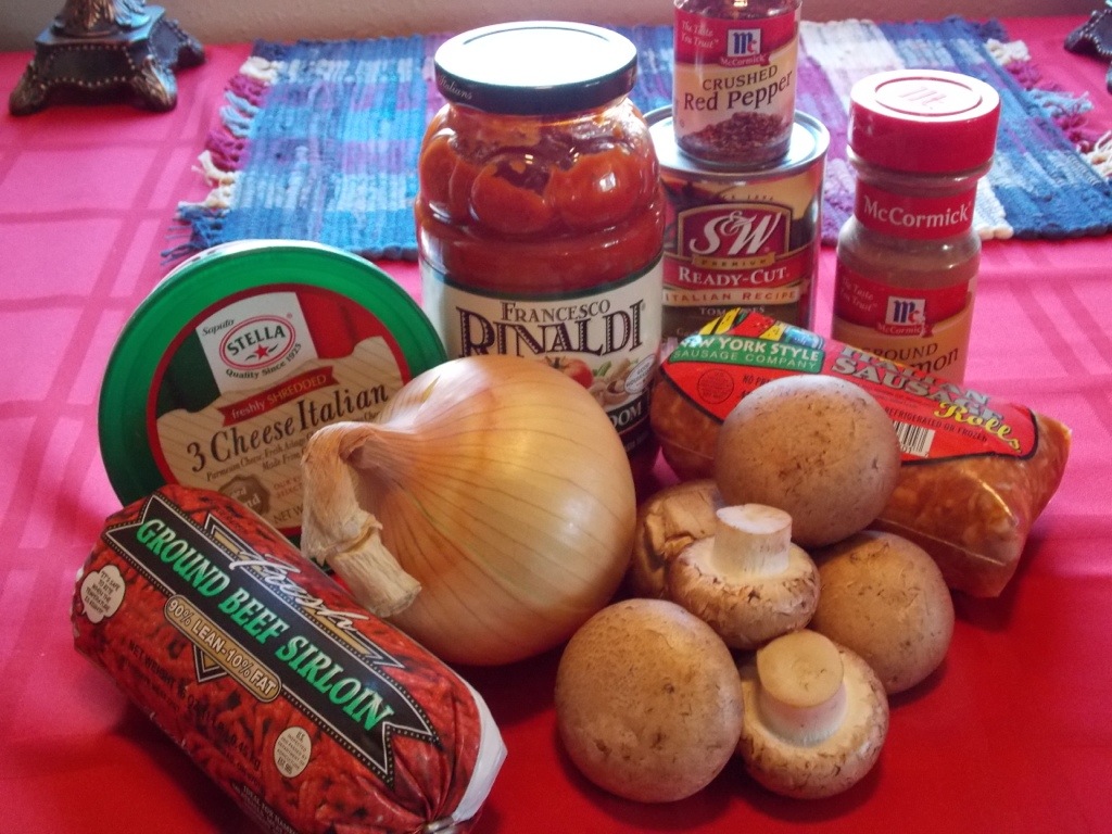 I sautéed the onion, garlic and mushrooms in a bit of olive oil and set that aside. I browned the ground sirloin and italian sausage. I put the veggies back in along with the remaining ingredients except for the cheese and pasta. I then let it simmer and mingle for about an hour.