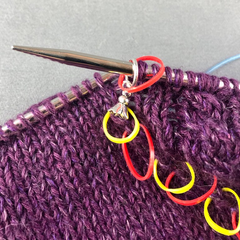 As you can see in photo above, I am keeping track of two different things so I’m using two different colored bands. I’m decreasing every 4 rows (red bands) and then every 2 rows (yellow bands). I counted out how many decrease I need to make and pinned them to my knitting with locking stitch markers.