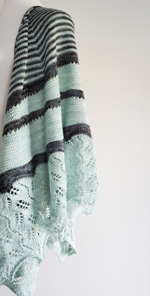 A crescent shaped shawl knit in SHJ Springy Sport yarn, Zania begins with simple stripes and short rows that then move into a gorgeous, flowy lace edging that frames the shawl. Knit the the beautiful cool colors of Earth Moves and Fog, Zania’s colors are reminiscent of an early, misty morning on the beach.