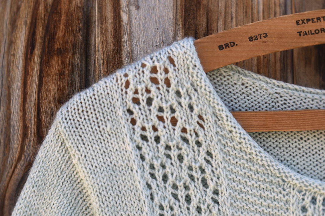 For the Cannon Beach Tee, I chose to use Heather’s Bouncy Fingering yarn, in her beautiful greenish-gray colorway, Fog. I wanted to create a light, airy tee with a bit of lace, along with a bit of texture. The tee has elbow length sleeves and slight A-line shaping for a little extra movement at the hips.