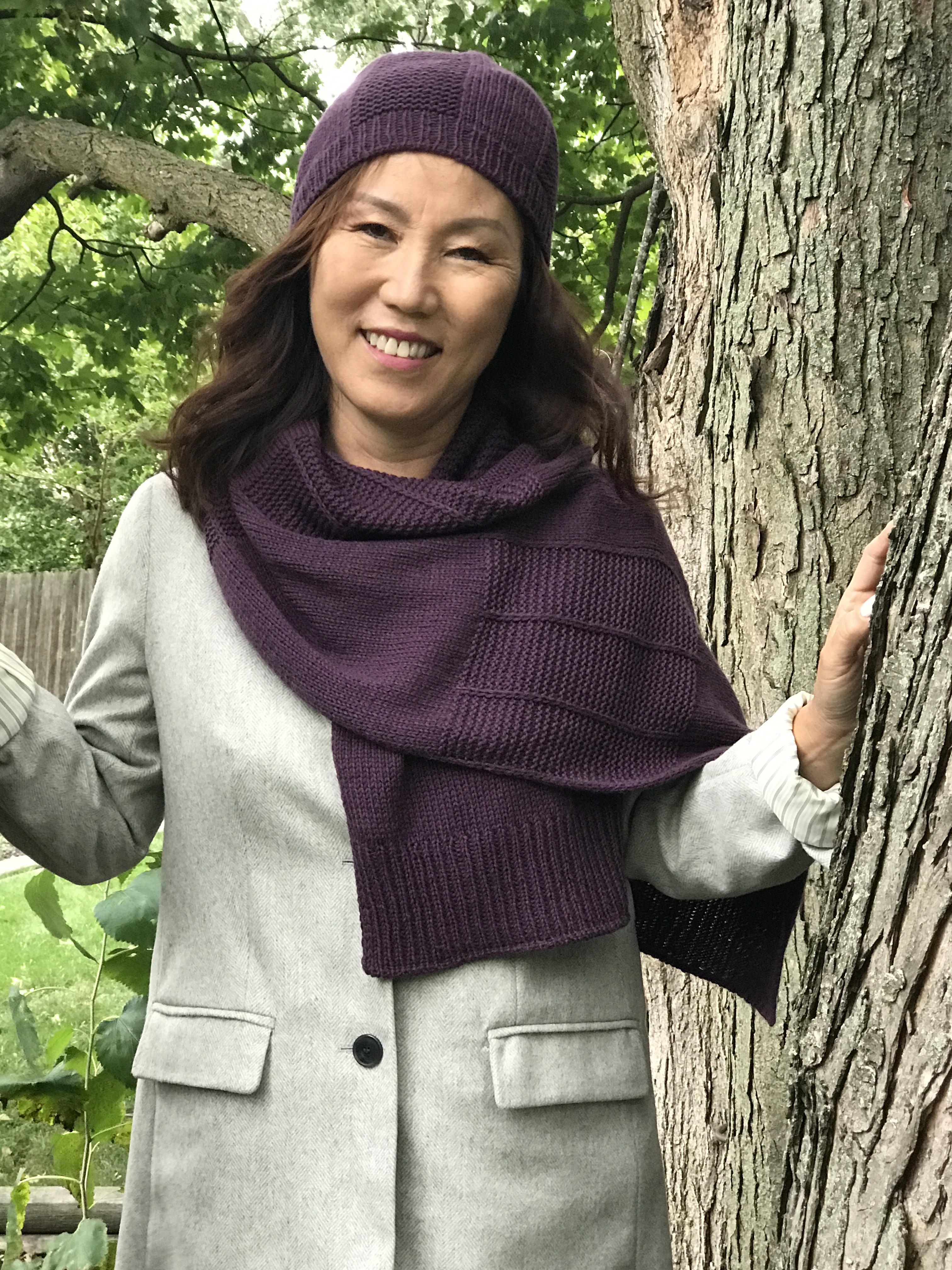 The LOSTINE Hat & Wrap are worked in June Cashmere DK. The stitch definition is shown nicely in these pieces, highlighting garter stitch and stockinette sections, separated by slipped stitches.